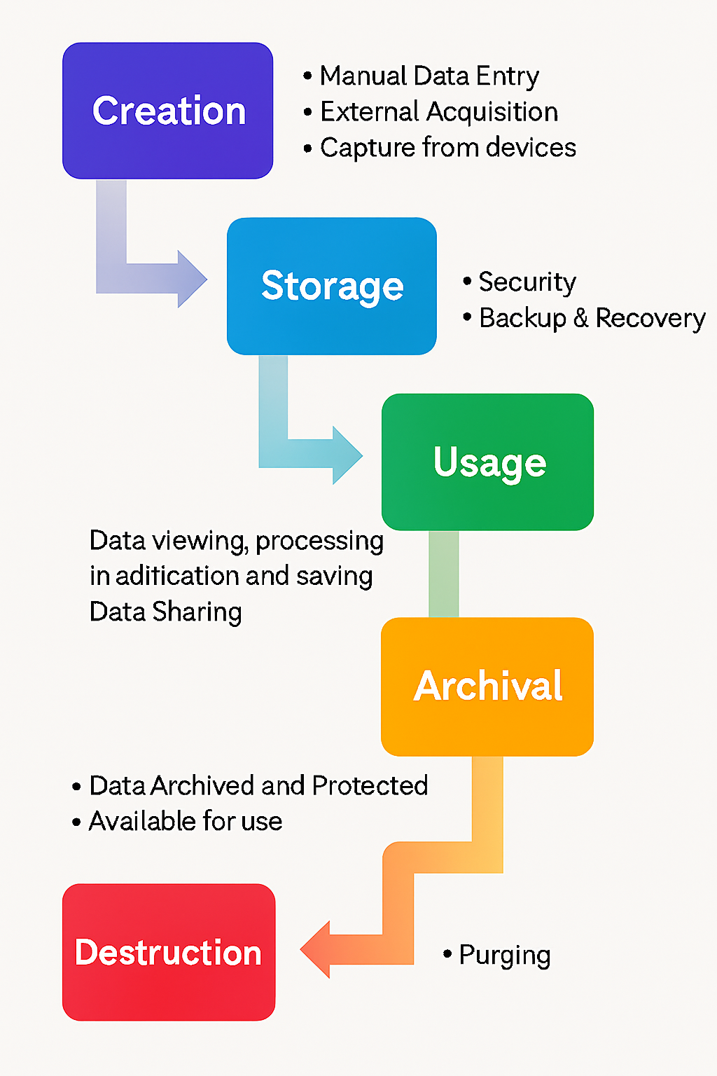Following creation, data requires secure storage with appropriate protection measures. Organizations must implement comprehensive backup and recovery procedures to maintain data availability and prevent loss during the lifecycle.