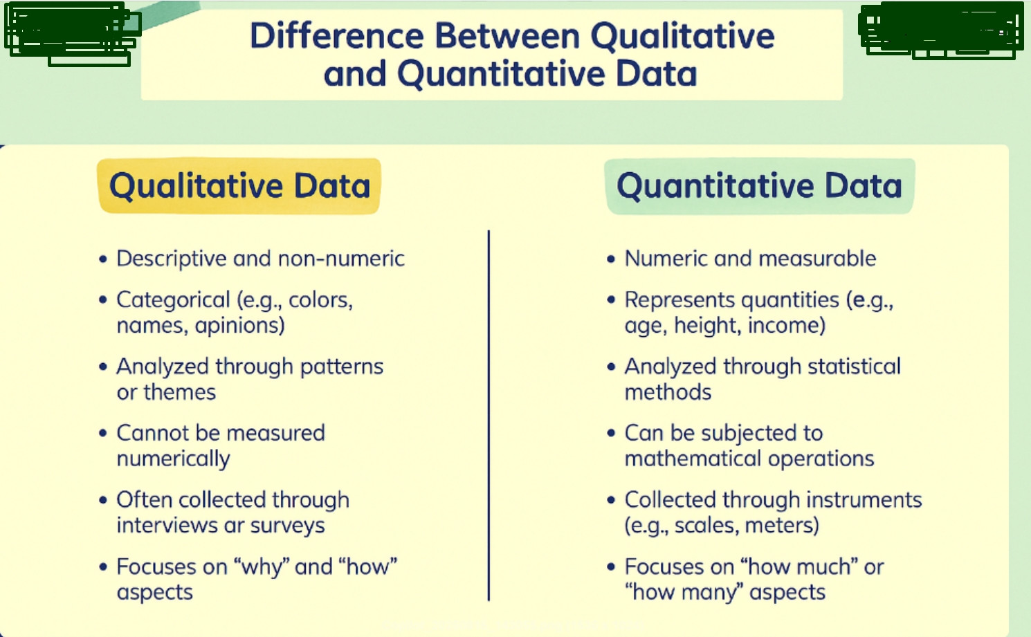 - Qualitative Data: Interpretation-based, descriptive, and language-focused.